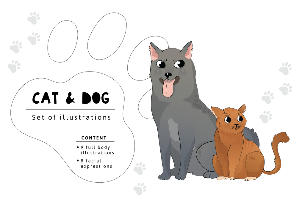 YOU’LL GET: set of CAT & DOG custom illustrations ; 4 different poses of each ; 4 expressions